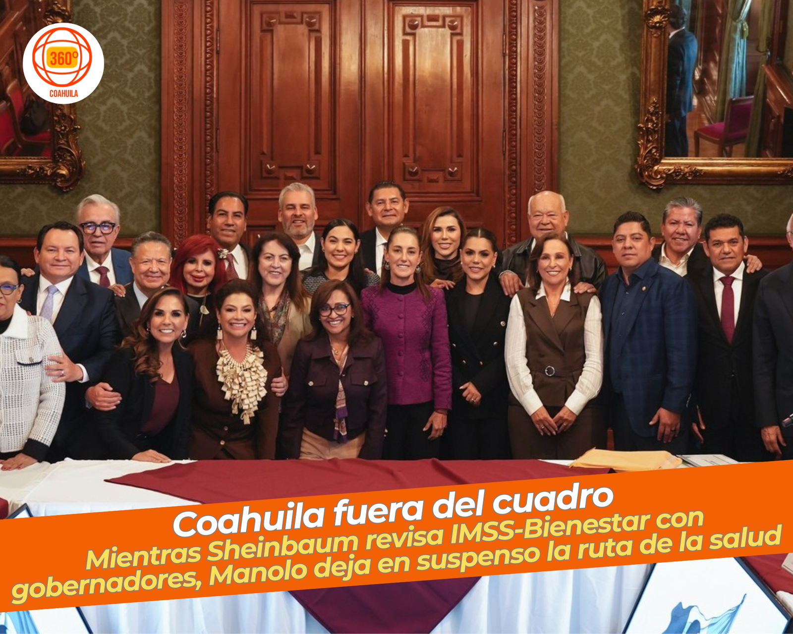 La presidenta Claudia Sheinbaum reunió este miércoles en Palacio Nacional a las gobernadoras y gobernadores de entidades incorporadas al IMSS-Bienestar para revisar avances del sistema federal de salud que promete atención y medicamentos gratuitos a millones de personas sin seguridad social; en la foto oficial aparece Tamaulipas, Veracruz, Sonora, Zacatecas y toda la plantilla morenista, pero no está Manolo Jiménez, cuyo gobierno mantiene a Coahuila fuera del acuerdo de federalización firmado ya por 23 estados que transfirieron más de 700 hospitales y casi 14 mil centros de salud al nuevo modelo.