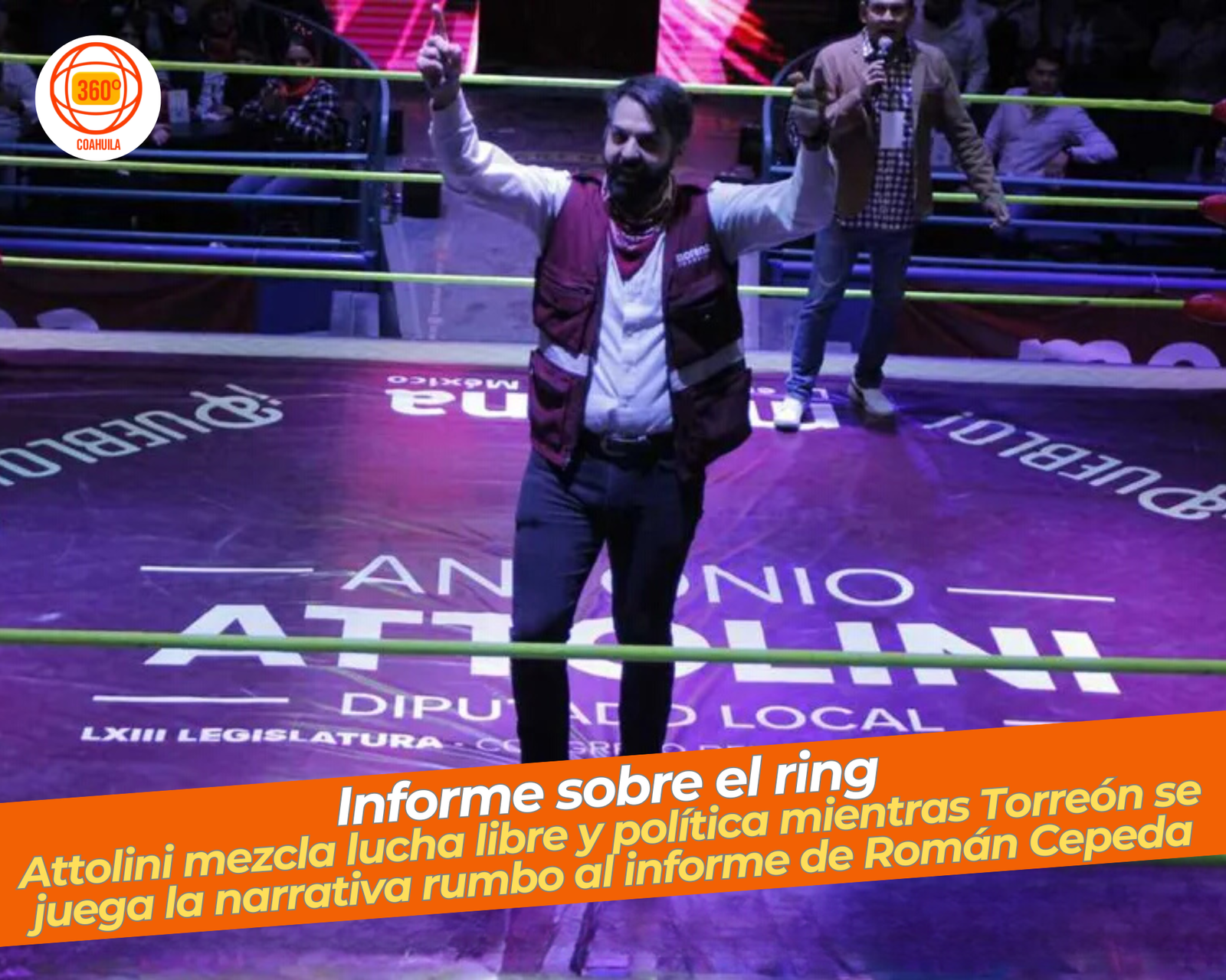El 20 de noviembre, coincidiendo con la Revolución Mexicana, la Arena Coliseo Tony Arellano se llenó de familias, niñas y niños para un informe legislativo poco convencional: tres luchas preliminares, una estelar, rifas de electrodomésticos y, al centro, el diputado morenista Antonio Attolini Murra saltando desde la tercera cuerda para rematar a tres luchadores enmascarados. Entre cada combate, el legislador habló de sus iniciativas en el Congreso de Coahuila, de la defensa del poniente de Torreón y del acompañamiento a la Cuarta Transformación, a la que calificó como “ganadora” de la noche.
