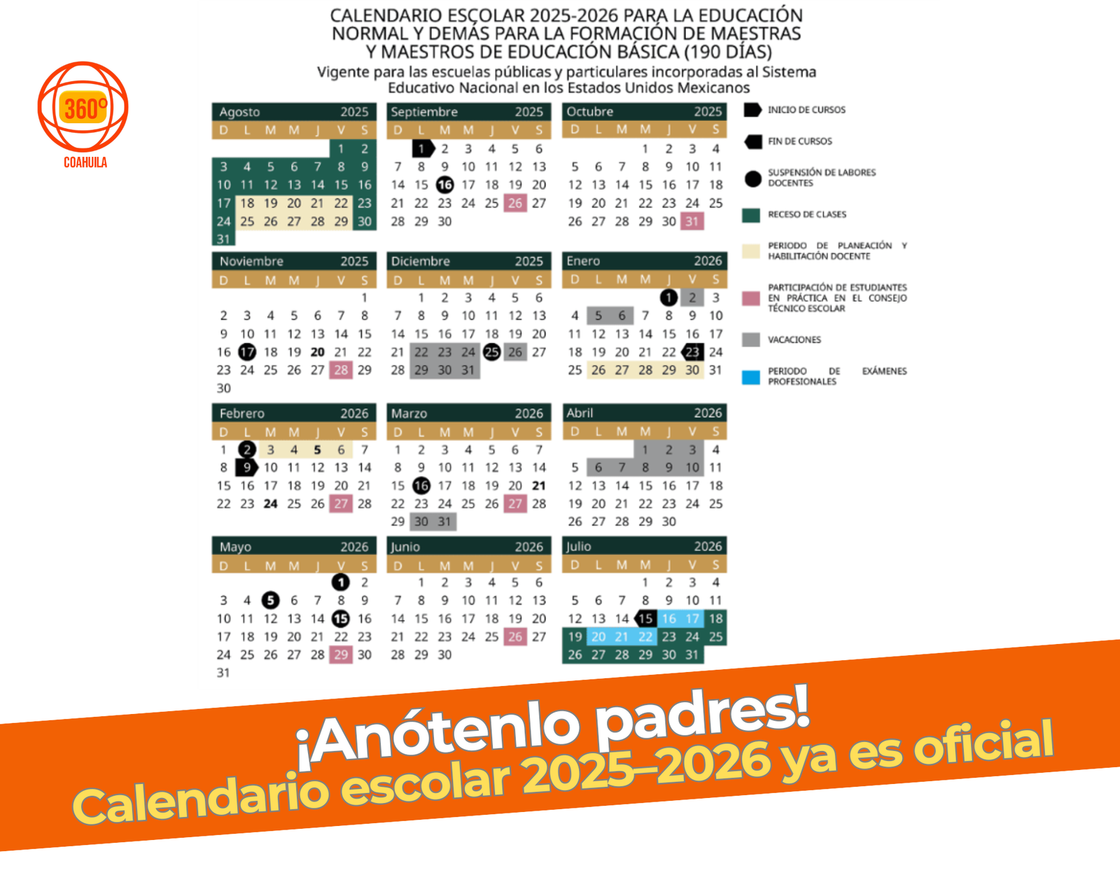 En Coahuila esto aplica a unos 650 mil estudiantes, de escuelas públicas y privadas. Además de las fechas de inicio y fin, ya están marcadas las vacaciones de invierno y verano, así como los puentes oficiales. Para evitar confusiones, las escuelas y padres deben ajustar horarios y materiales desde ya.
