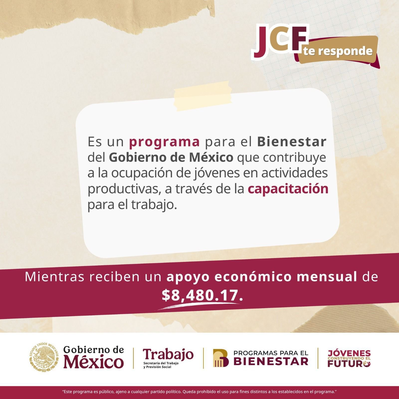 Las y los aprendices reciben durante su capacitación una beca mensual de $8,480 pesos por hasta 12 meses, además de seguridad social a través del IMSS, una constancia de capacitación que fortalece su currículum y seguimiento para su posible contratación en el centro de trabajo donde se desempeñen. El registro se realiza en línea en la página oficial: jovenesconstruyendoelfuturo.stps.gob.mx/aprendiz.