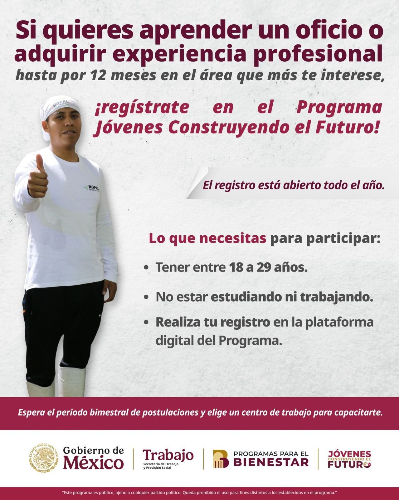 La Secretaría de Bienestar en Coahuila informa que del 1 al 7 de octubre de 2025 estará abierto el siguiente periodo de postulaciones del programa Jóvenes Construyendo el Futuro, una iniciativa del Gobierno de México, operada por la Secretaría del Trabajo y Previsión Social (STPS), que brinda a jóvenes de 18 a 29 años, la oportunidad de capacitarse en un centro laboral y adquirir experiencia que les permita incorporarse al mundo del trabajo.