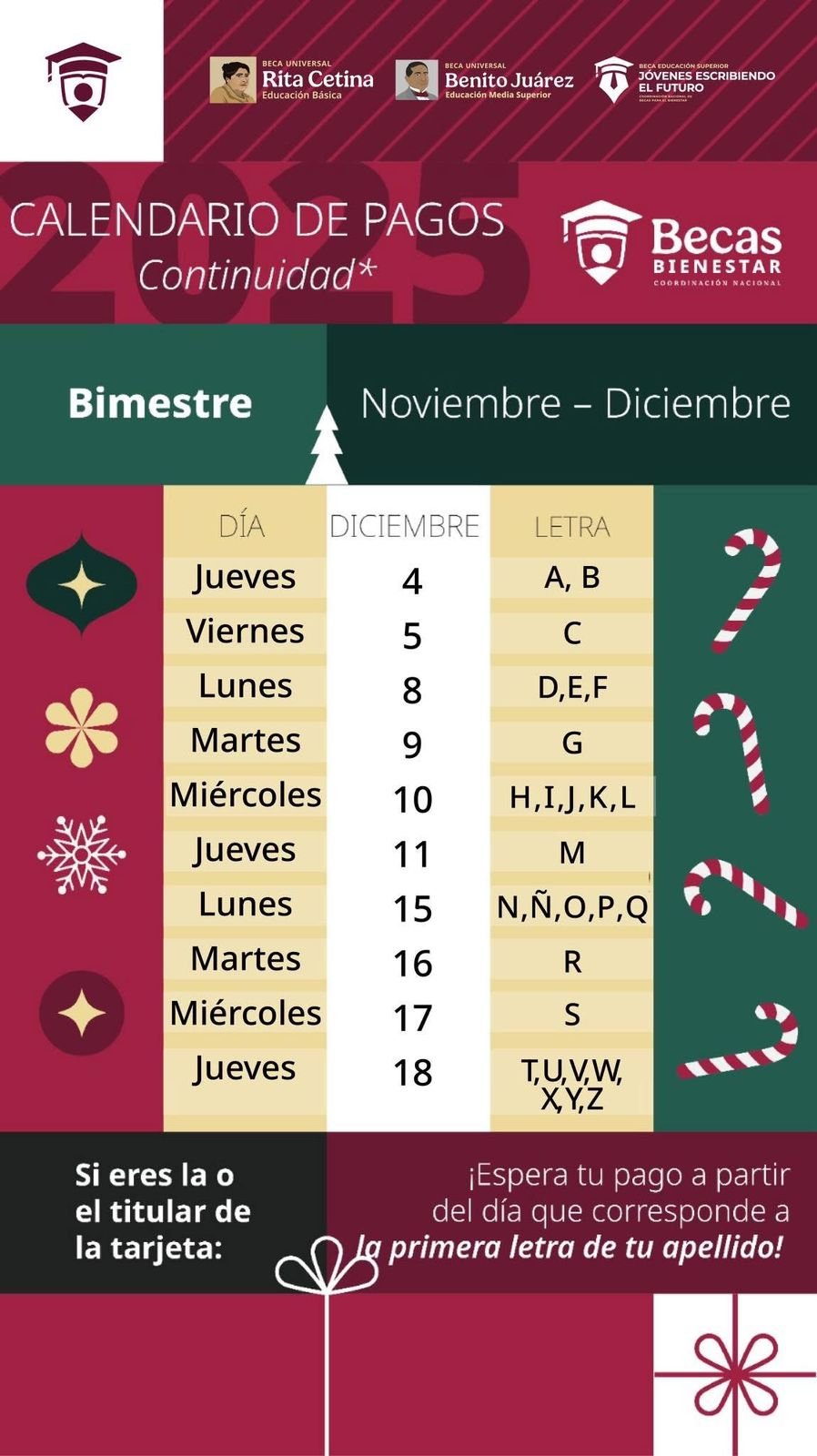 La Secretaría de Bienestar Coahuila comparte el calendario de pago del segundo bimestre del ciclo escolar 2025–2026 para las y los becarios de continuidad de las becas “Rita Cetina”, “Benito Juárez” y “Jóvenes Escribiendo el Futuro”, correspondiente a los meses de noviembre-diciembre. Los depósitos se efectuarán de manera escalonada y por orden alfabético conforme al primer apellido.
