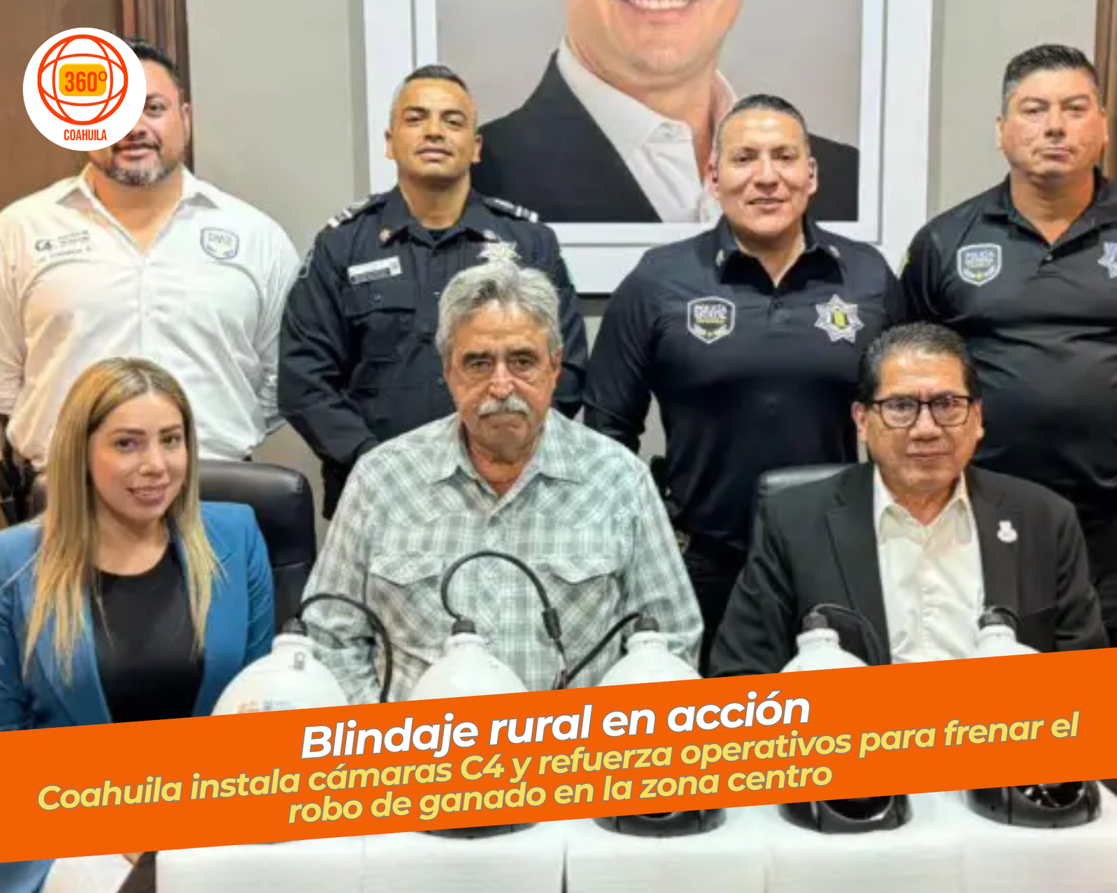 Cinco cámaras de videovigilancia del sistema C4 fueron entregadas en la Región Centro de Coahuila para fortalecer la seguridad rural. La acción complementa operativos permanentes de revisión de ganado y vigilancia coordinada con comunidades ganaderas.