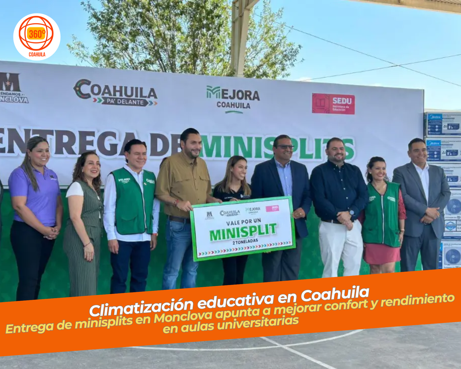 En Monclova, el alcalde Carlos Villarreal Pérez, junto al subsecretario de Gobierno Sergio Sisbeles y el subsecretario de Educación Media Superior Saúl Noberón Contreras, entregaron simbólicamente 20 minisplits —10 para el Instituto Tecnológico Superior de Monclova y 10 para la Universidad Politécnica Monclova-Frontera— para instalar en aulas y oficinas administrativas.