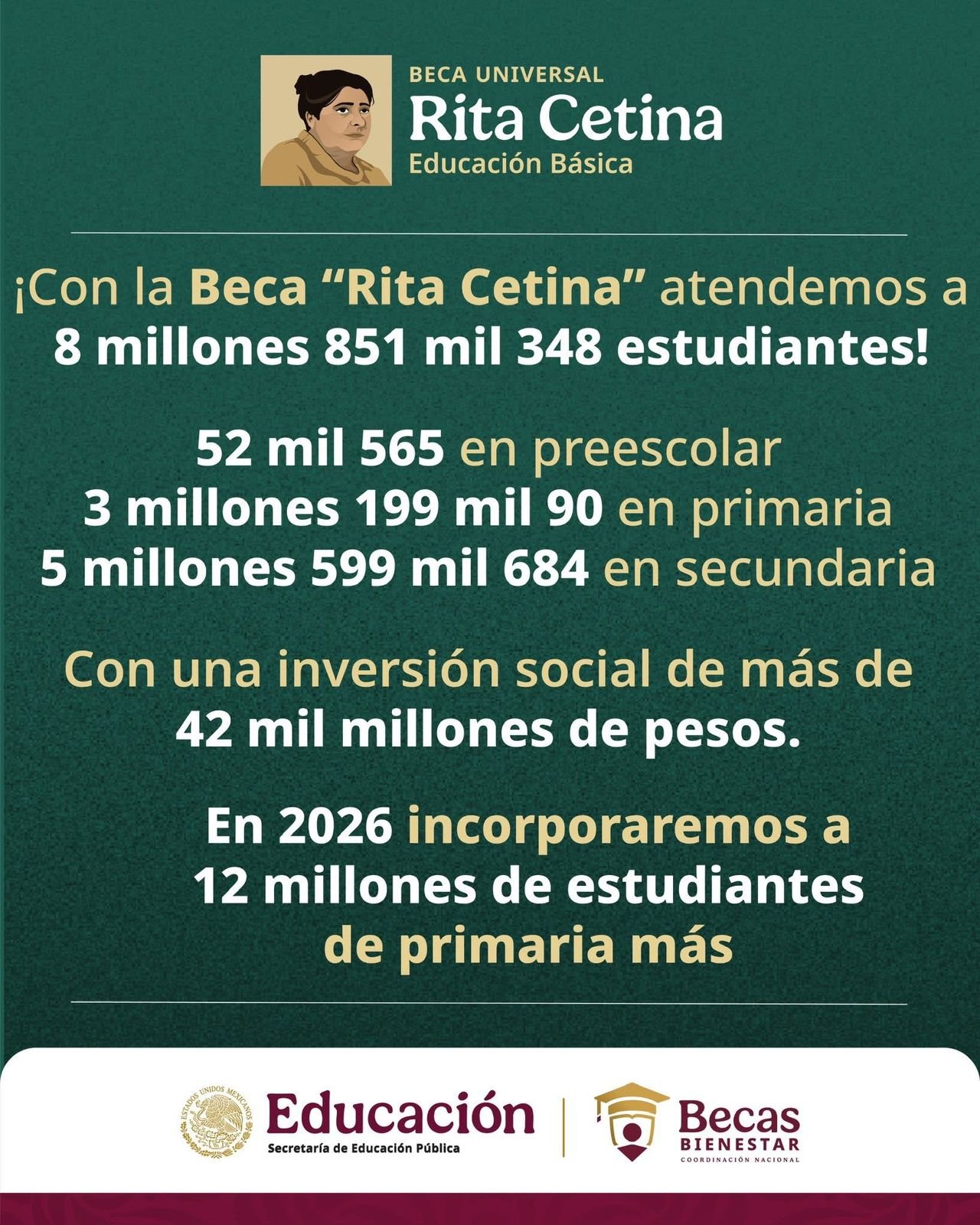 Durante la conferencia matutina del 17 de noviembre de 2025, se detalló que la Beca “Rita Cetina” llega actualmente a 8 millones 851 mil 348 estudiantes: