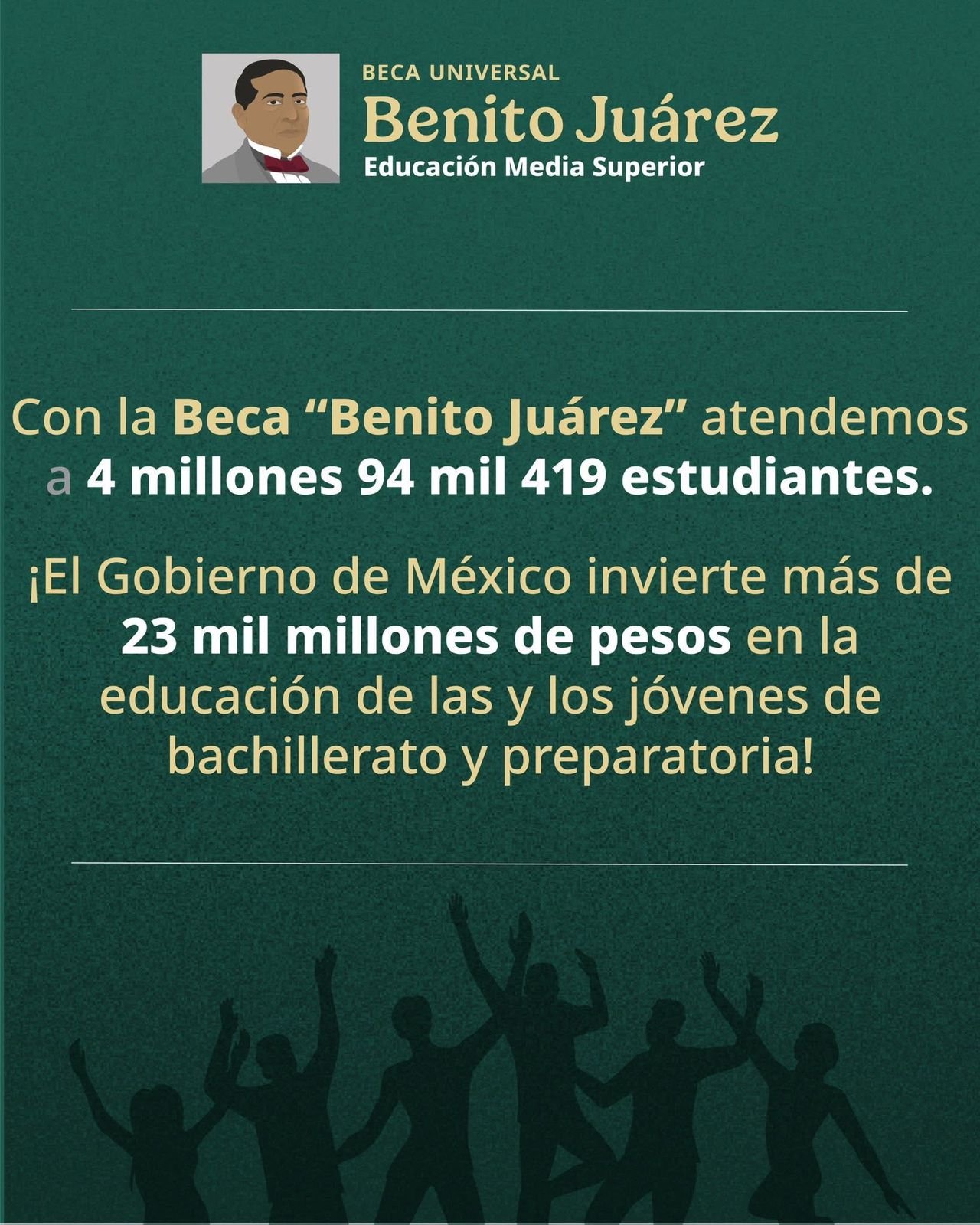 En el nivel de educación media superior, la Beca “Benito Juárez” beneficia a 4 millones 94 mil 419 estudiantes, con una inversión de más de 23 mil millones de pesos, garantizando que jóvenes de preparatoria y bachillerato continúen sus estudios sin barreras económicas.