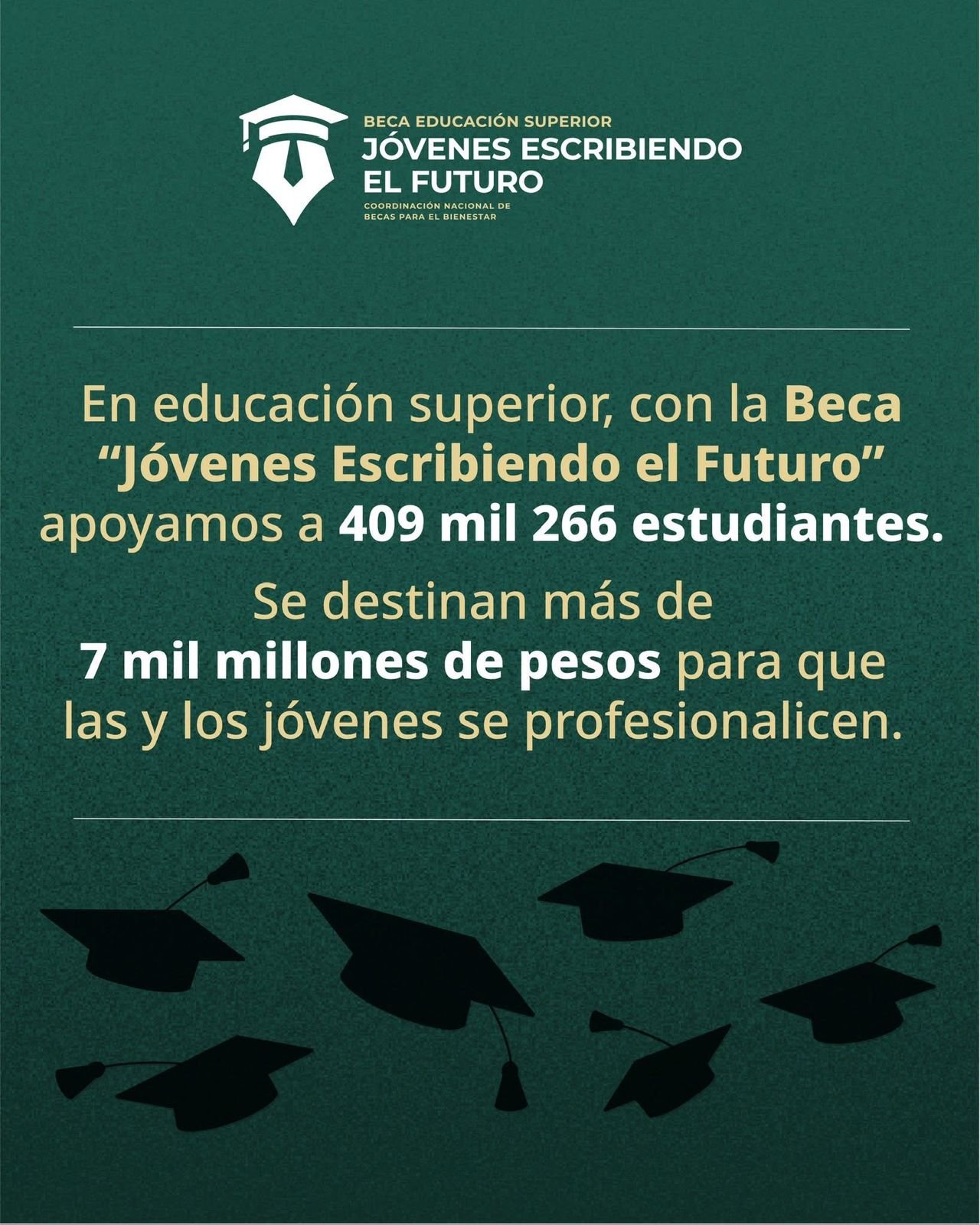 En educación superior, la Beca “Jóvenes Escribiendo el Futuro” respalda a 409,266 universitarias y universitarios, con una inversión nacional que supera los 7 mil millones de pesos.