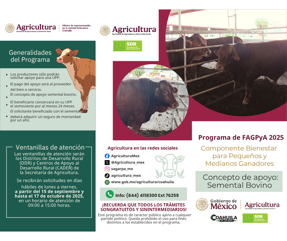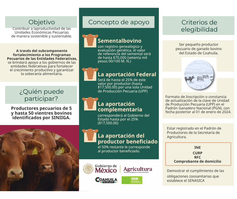 Este programa, impulsado por el Gobierno de México, está dirigido a ganaderos que cuenten con entre cinco y cincuenta vientres bovinos registrados en el Sistema Nacional de Identificación Individual de Ganado (SINIIGA). Su objetivo es mejorar la calidad genética del hato nacional mediante la compra de sementales con valor comprobado, contribuyendo al desarrollo sostenible y competitivo de la ganadería coahuilense.