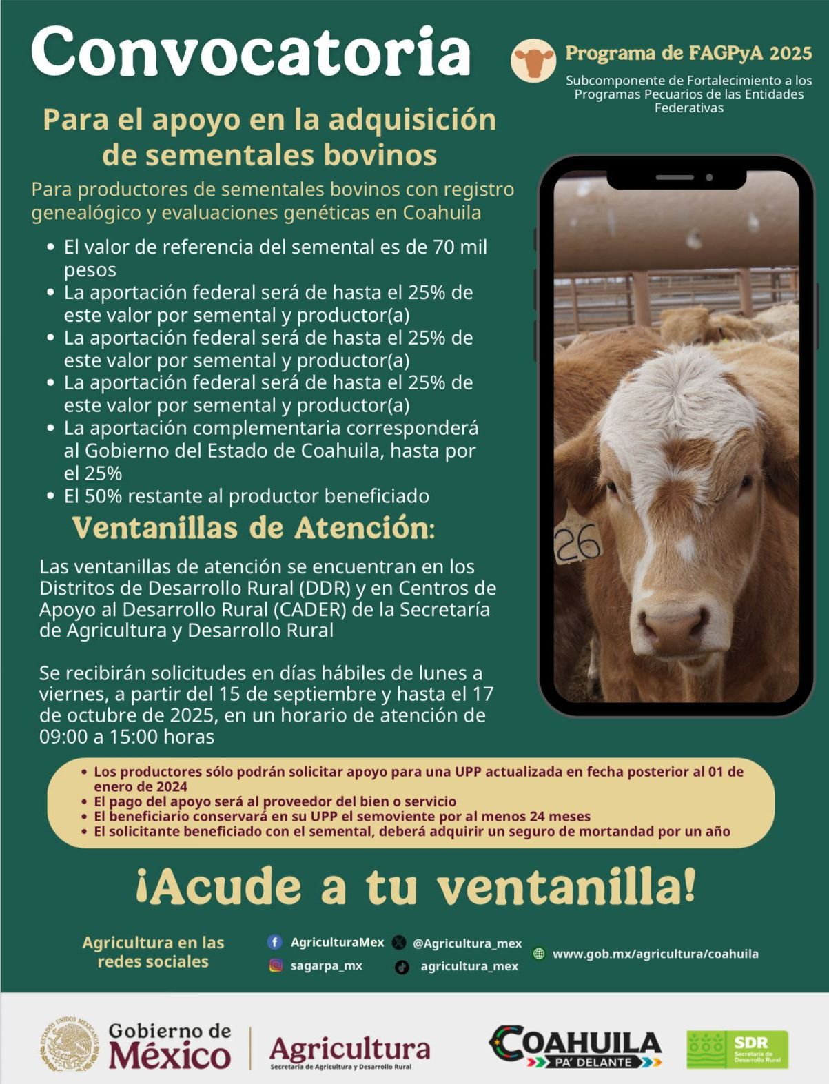 Coahuila de Zaragoza, Octubre de 2025.– La Secretaría de Agricultura y Desarrollo Rural (SADER) anunció la apertura de ventanillas en Coahuila y la Región Lagunera para que ganaderos interesados participen en la convocatoria de apoyo para la adquisición de sementales bovinos con registro genealógico y evaluaciones genéticas, con el propósito de fortalecer la productividad del sector pecuario en la entidad.