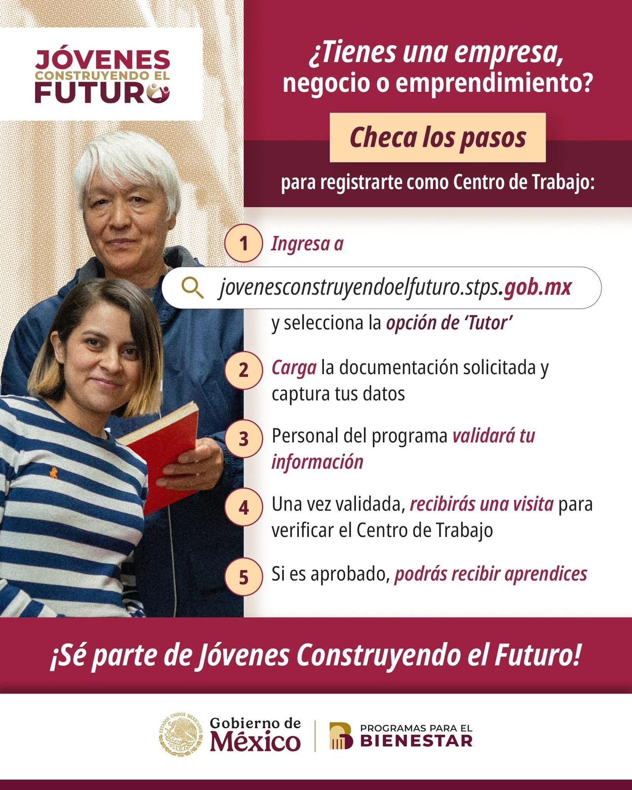 A través de este programa, las y los tutores pueden recibir a jóvenes en sus centros de trabajo durante 12 meses, tiempo en el que el Gobierno de México les otorga un apoyo económico equivalente al salario mínimo vigente y seguro médico en el IMSS. De esta manera, las y los beneficiarios adquieren experiencia real en un entorno laboral, mientras que los centros de trabajo fortalecen su capital humano y su productividad.