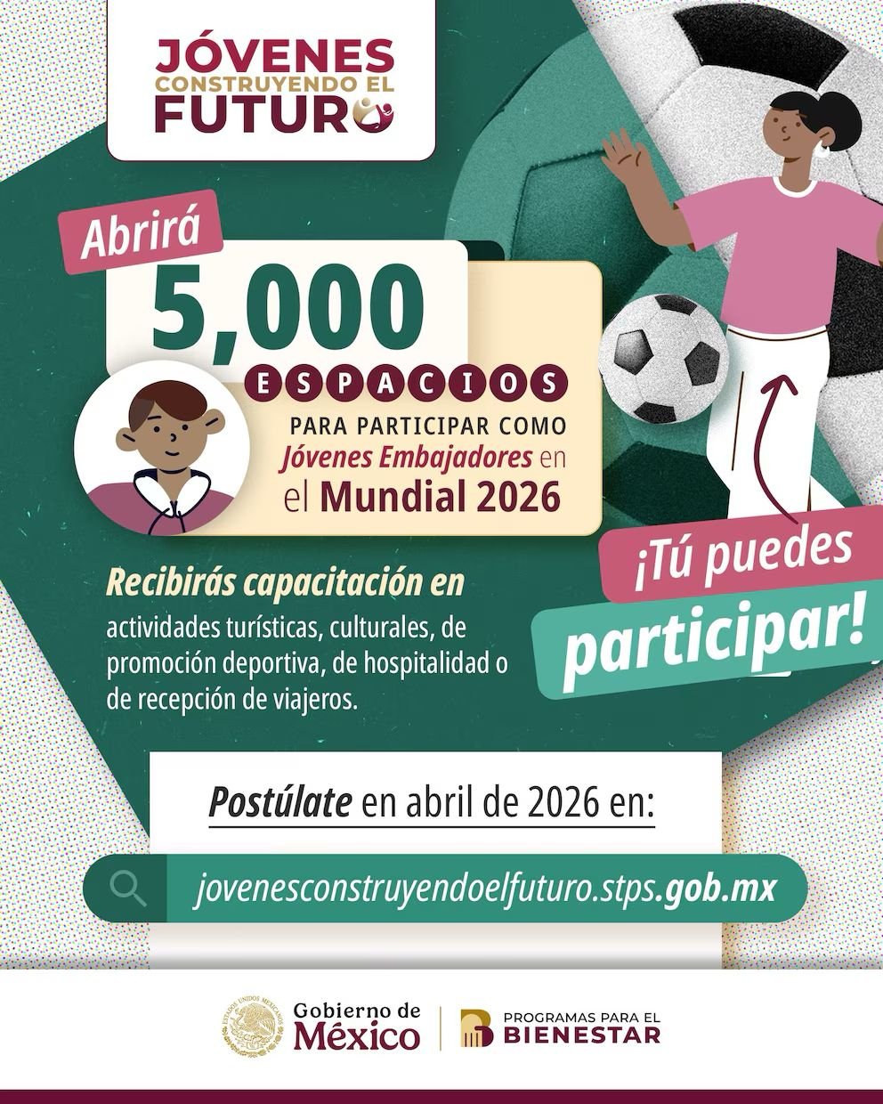 La Secretaría de Bienestar en Coahuila informa que el programa Jóvenes Construyendo el Futuro se suma al Mundial de Futbol 2026 con la iniciativa “Jóvenes Embajadores en el Mundial”, una oportunidad única para que juventudes coahuilenses formen parte de uno de los eventos más importantes del mundo.