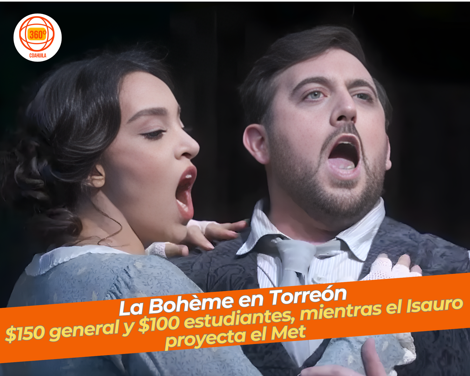 Este sábado 15 de noviembre a las 12:00, el Teatro Isauro Martínez proyecta La Bohème del Met de Nueva York en pantalla gigante: $150 boleto general y $100 para estudiantes y adultos mayores. Un precio de entrada amigable que acerca una producción de primer nivel a familias, maestras y estudiantes de La Laguna—y que pone sobre la mesa cómo democratizar la oferta cultural en todo Coahuila.