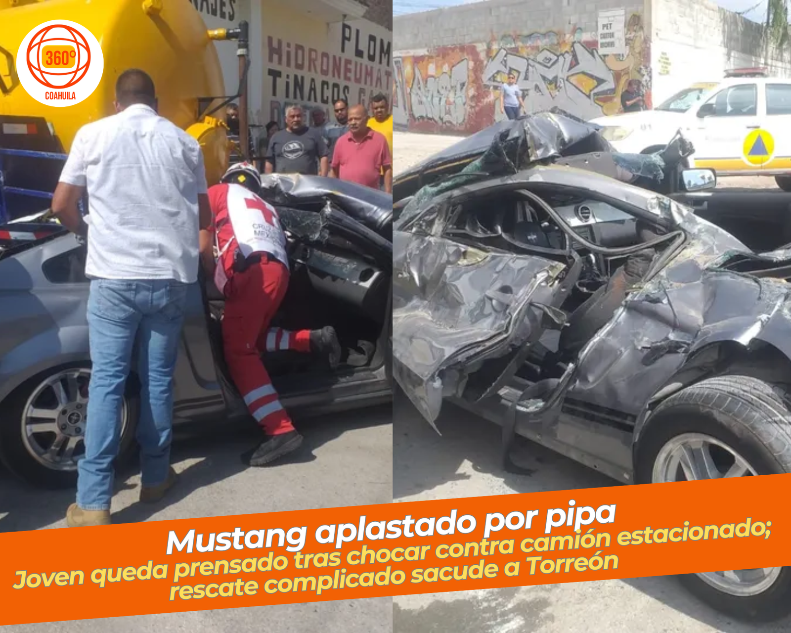 • Mustang aplastado por pipa: Joven queda prensado tras chocar contra camión estacionado; rescate complicado sacude a Torreón