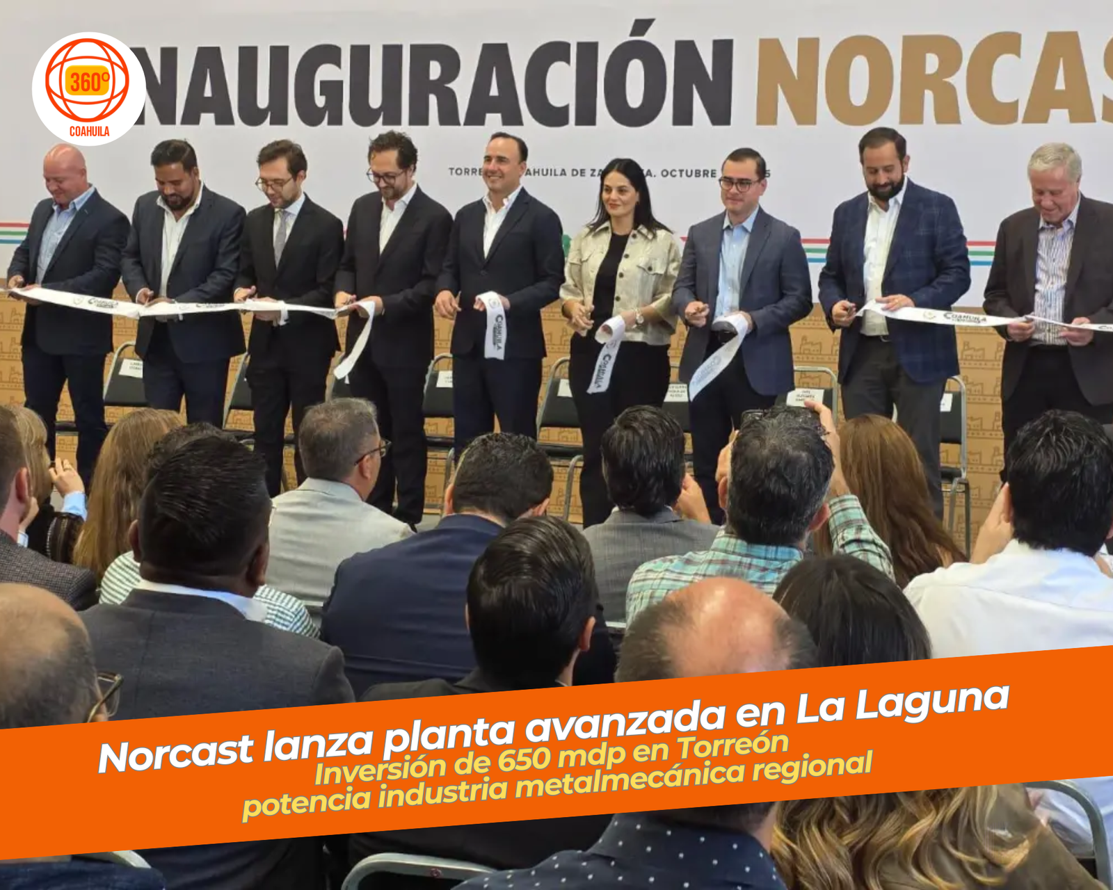 El gobernador Manolo Jiménez Salinas inauguró en Torreón la nueva planta de Norcast, ubicada en el parque industrial Global Industrial Park, con una inversión anunciada de 650 millones de pesos y una creación inicial de 400 empleos directos.