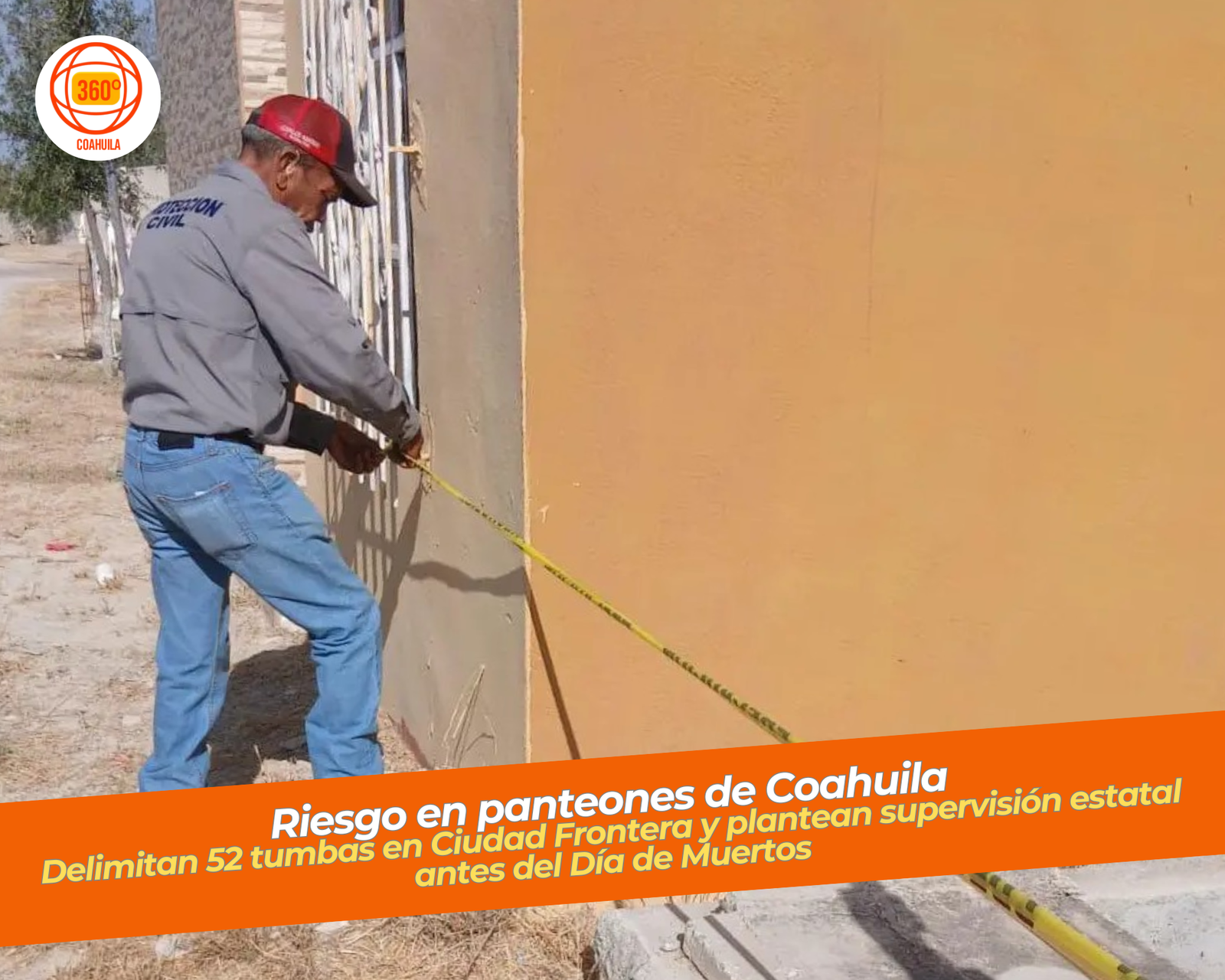El municipio de Ciudad Frontera, en la región Centro-Desierto de Coahuila, activó un operativo especial previo a las festividades de Día de Muertos, mediante el cual se delimitaron 52 tumbas consideradas inestables o con peligro para visitantes. El director de Protección Civil municipal informó que el plan contempla ambulancias, paramédicos, unidad de ataque rápido y la coordinación con otras áreas municipales para atender posibles incidentes.
