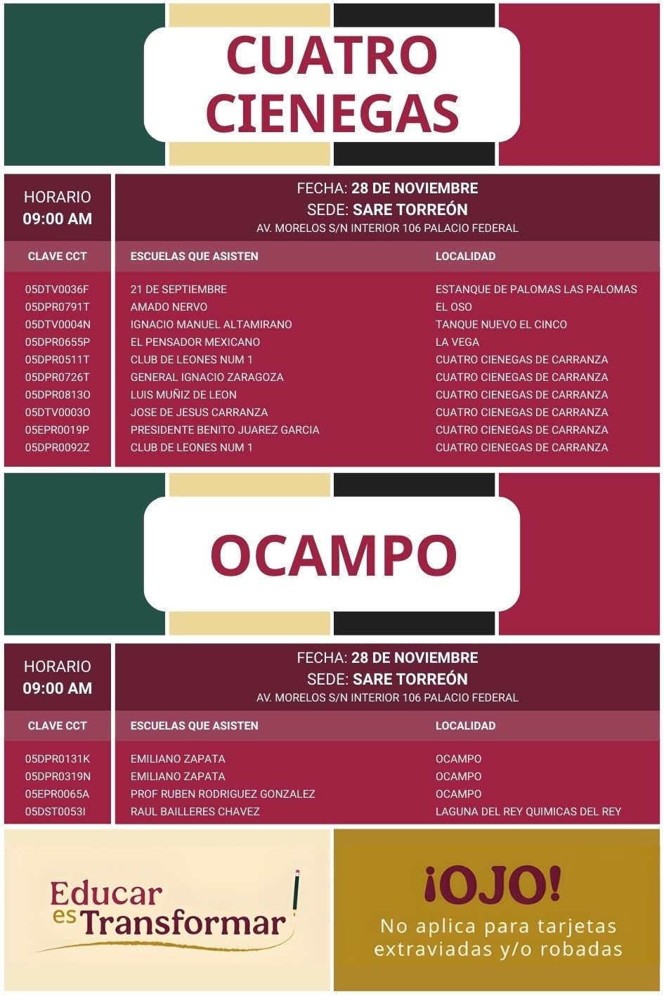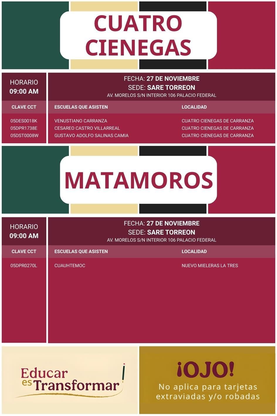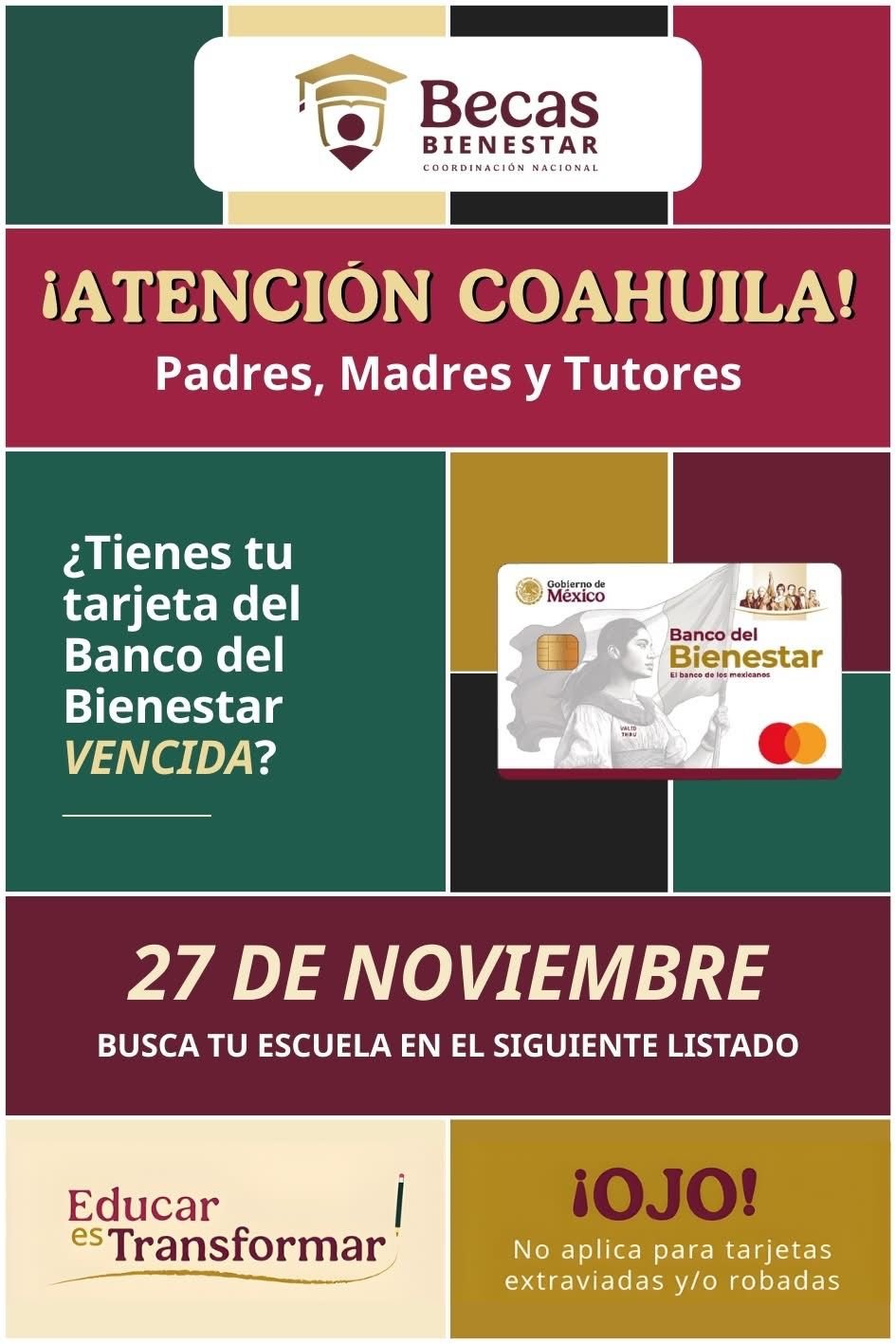 La Secretaría de Bienestar, en coordinación con Becas para el Bienestar en el Estado de Coahuila, informa a madres, padres y tutores que los días 27 y 28 de noviembre de 2025 se llevará a cabo la última fase de entrega de tarjetas del Banco del Bienestar para quienes tienen plásticos vencidos y requieren una reposición para seguir recibiendo los apoyos educativos.