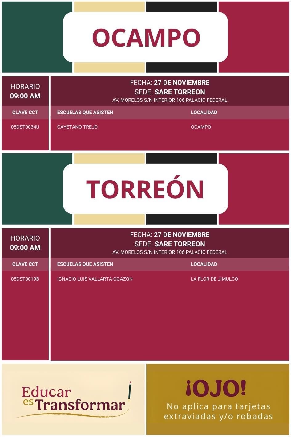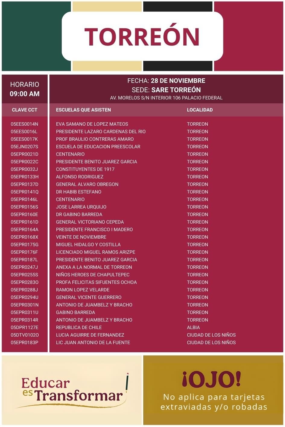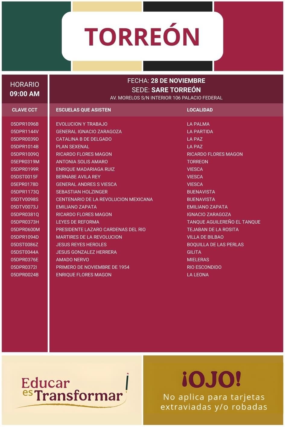 La Secretaría de Bienestar, en coordinación con Becas para el Bienestar en el Estado de Coahuila, informa a madres, padres y tutores que los días 27 y 28 de noviembre de 2025 se llevará a cabo la última fase de entrega de tarjetas del Banco del Bienestar para quienes tienen plásticos vencidos y requieren una reposición para seguir recibiendo los apoyos educativos.